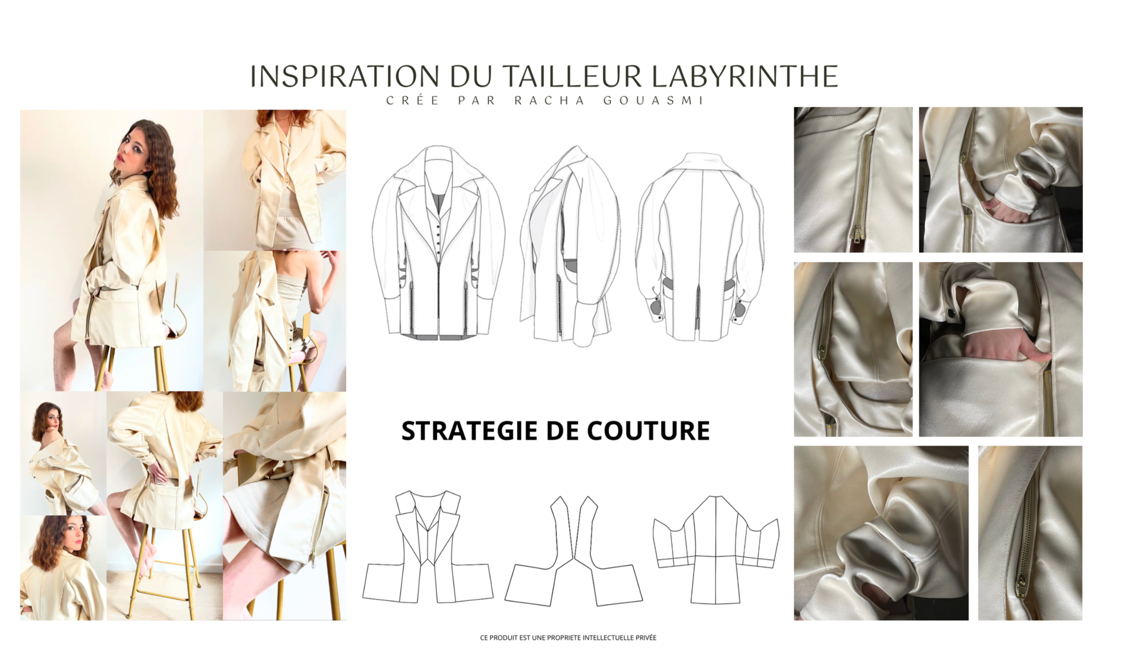 Des années plus tard, lors de ses études en design, elle crée un tailleur aux découpes complexes, presque instinctives. Ce n’est qu’une fois la pièce achevée qu’elle comprend : cette structure n’est pas un exercice de style, mais une expression naturelle de son mode de pensée. Le labyrinthe n’est pas un motif choisi. C’est un langage intérieur.